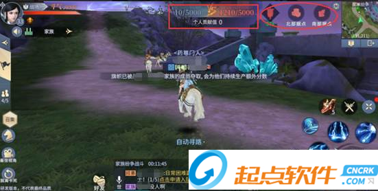 在活动地图内,我们可以在界面的右上角看见“北部据点”、“南部据点”和中间“战旗”的图标,点击图标可以直接寻路前往。同时,这里也可以非常直观的查看到它们的被占领情况。在屏幕的中上方显示的则是个人的贡献值,和双方家族的比分情况,活动时间内,任意一方家族积分率先达到5000便判定为获胜。