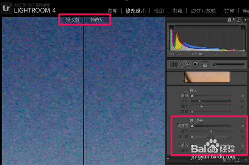 我们按快捷键Y来打开修改前后对比,方便查看降噪效果。细节命令中的减少杂色可以有效降低照片的明亮度噪点和颜色噪点。