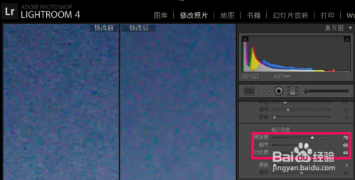 向右调节明亮度的滑块或者直接更改数值可以降低照片的明亮度噪点,不可避免会损失照片的细节,而向右调节细节滑块可以恢复一些照片的细节,调节对比度可以进一步调整降噪的效果。