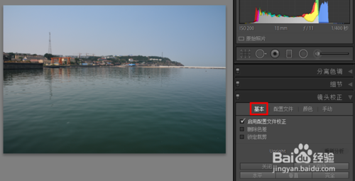 在lightroom镜头校正中选择基本,可以启用配置文件校正,并进行其它设置。