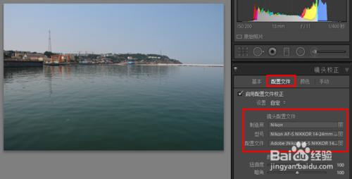 在lightroom镜头校正中选择配置文件,我们可以根据我们的使用的单反选择镜头的制造商和型号以及其配置文件,lightroom会自动进行校正。