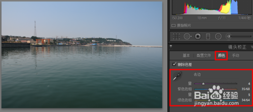 在lightroom镜头校正中选择颜色,我们可以对去边进行设置。