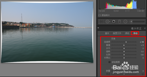在lightroom镜头校正中选择手动,我们可以手动调节因单反镜头而导致的照片变形。