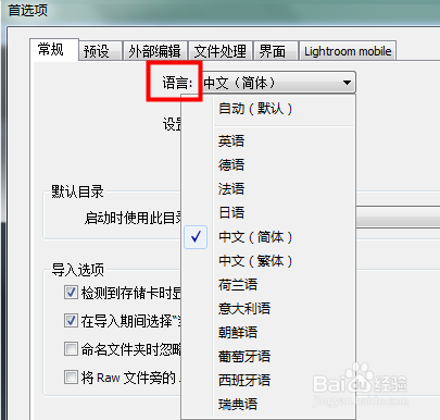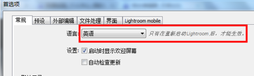 在这里我们将lightroom界面语言设置成英语,可以看到要重启lightroom后才会生效。