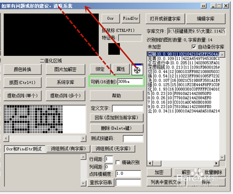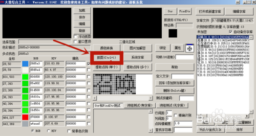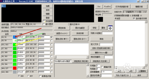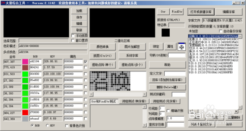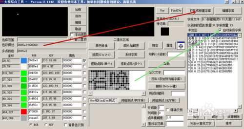 11、点中字体中颜色后,你想抓的字就显示二值化区,而且还有记录字体的颜色值和坐标!如图