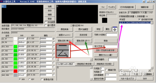 12、想保存这字体方法就是,先鼠标左击红箭头或者绿箭头所指的提取点阵(提取点阵多个,是指字体的距离,点击有选择项),出现红框中的云字,在定义文字框里也打上云字,就可以按回车键。这样就是抓好的字保存好了,可以在你的字库的文字文本里面看到数据!注意的是抓两个字以上的就是字组,方法一样,比如你抓的字是小鱼,那文字定义也是打入小鱼,按回车即可。
