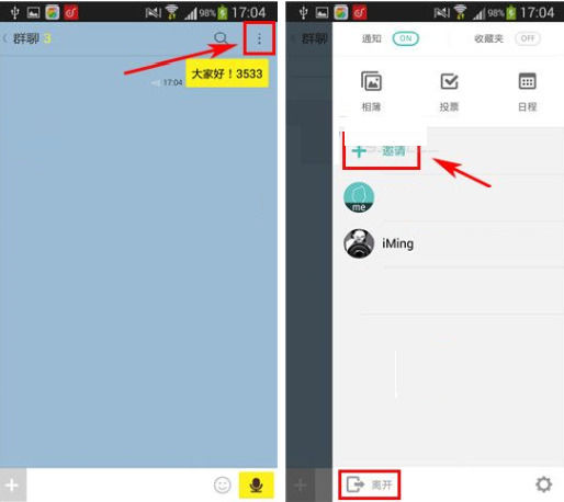 3)在群聊室中,点击【三点】,可点击【+邀请】继续添加聊天人,点击【离开】可退出该聊天室。(如下图)