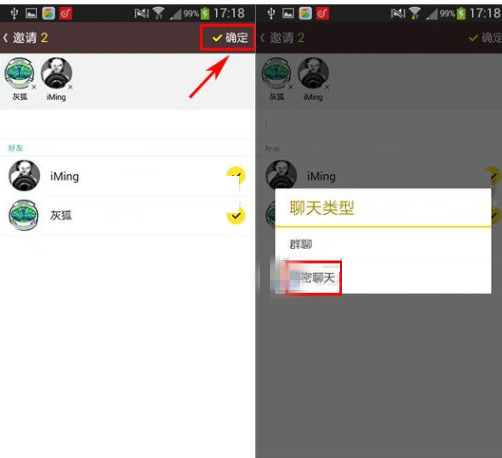 2)勾选要邀请的好友,点击【确定】,选择【私密聊天】。(如下图)