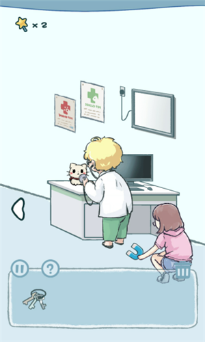 33、左边房间的壁纸拿到?、状态栏上面的暂停变成了?,右边房间狗的气泡里拿到?,贴在医生气泡里的三只猫身上。