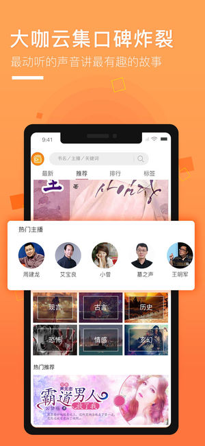 有声小说涵盖玄幻、修仙、都市、言情、恐怖、官场、穿越、同人、耽美、校园、军事、总裁、武侠、网游、历史、奇幻、灵异、推理等各类型热门网络原著小说。