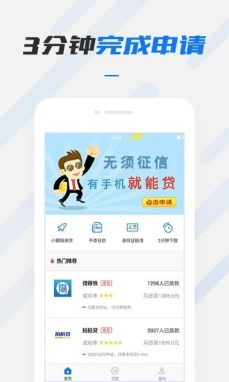 1、操作简单:借款人只需简单三步完成贷款申请。2、额度灵活:贷款额度支持500元-100万的贷款申请。