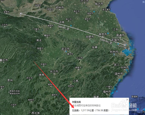 然后,在地图上点一下起点和终点位置,如西安到上海的直线距离,显示在最下方是1217.59公里,上方标尺处也有写明