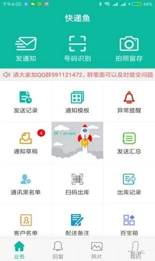 “快递鱼”是上一款国内领先的外卖,快递取件派件通知软件。无论是学校网点、商区自提还是社区门口集中派送,只要是以短信方式通知取件的,就可以使用“快递鱼”通知助手!它是派件员必备神器,支持扫描录入准确率百分99,语音录入配送件,可以批量发短信,短信自带编号,包裹只要按顺序放好,就可以快速定位。客户取件时,就能迅速找到快件。此款软件能大大提升工作效率,一人轻松管理一千件!