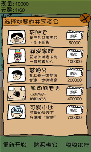 爱上我的鸭游戏是一款非常有趣的养成休闲小游戏,玩家在游戏中主要以卖鸭子为主,你可以卖鸭肉也可以整只出售,随便你怎么卖,而且这里有好多种鸭鸭哦,每只都有自己的特色,当然有舍才有得啊,虽然看似很无聊很简单,其实还是有一点策略性的,而且这里的鸭鸭都长的好魔性啊,画风就不说了,反正也是作者随手画的,但可玩性还是比较高的。下面小编就简单的介绍一下有关这款游戏的玩法。首先在游戏中最左上角显示的是现金和天数,玩家需要的限定的天数结束之前购买共享老公