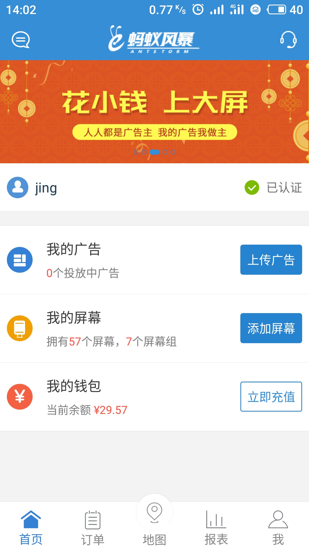 蚂蚁风暴app是一款高效率的营销平台,用户通过该平台投放广告可以快速提升知名度,价格优惠营销质量高,个人订单列表详细显示,支持多城市切换。蚂蚁风暴app依托互联网+技术手段实现智能终端匹配和受众准确投放,让闲置、孤立、碎片的“屏”资源,流通起来,解决中小企业的广告投放难题,助力更多的民族品牌崛起,让人人都能做广告,人人都能投广告。