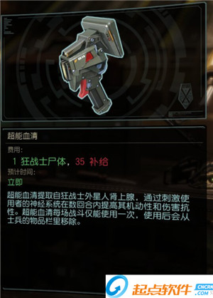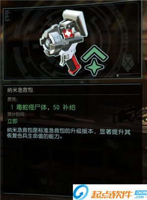 简介:超能血清你以为你换个马甲我就不认识你了么!!制作急救包消耗35点补给,在战斗中消耗1点行动力回复4点生命值,解剖毒蛇怪后解锁战场药物项目(升级急救包为上图回复生命值提高到6点),并解除中毒、酸蚀、燃烧,升级专家复活协议后还可以解除恐慌、混乱、血流不止状态。