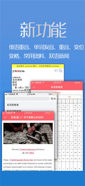 千亿词霸app是俄语翻译学习专业小助手。千亿俄语词霸app支持俄汉汉俄双向基本释义、行业释义、例句、重音、变位变格信息查询翻译。千亿词霸app经过千亿系列软件多年经验积累,精心设计,汇集千亿最完善的优选词库,更增加很多新功能,希望对您学习、工作有帮助。