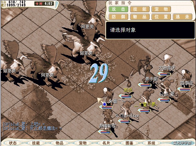 “魔力宝贝”与怪物战斗是随机发生的,在与敌人遭遇时,便会转移到战斗画面,立即进入战斗模式。战斗采回合制,30秒内要决定自己的物理攻击行动或魔法的行动。每位角色在1个回合中可以做2个动作,如果有宠物,则是角色与宠物各一个动作。战斗画面下方为玩家,上方是敌方,PK对战时,敌队会显示在左上方。战斗画面下方为玩家,上方是敌方,PK对战时,敌队会显示在左上方。