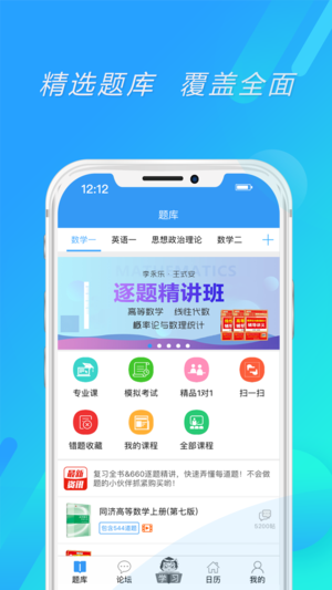 1、考研题库考研题库由三大板块构成,历年的考研真题,包括了2018年及2018年前十多年的考研真题5万多道,试卷300余份。课后习题,如:同济版的高等数学,线性代数,浙大版的概率论和数学统计,马克思主义基本原理,毛泽东思想和中国特色社会主义理论体系,中国近代史纲要,思想品德修养与法律基础。各位考研一线教师的考研资料,如:李永乐的考研数学复习全书(高数、线代、微积分)660题,李正元的考研数学复习全书(考研数学一、考研数学二、考研数学三)陈文灯的考研数学复习指南,肖秀荣的命题人1000题,徐之明的考研政治红宝书等。本题库可以为永久免费,一款APP在手随时随地的学习。