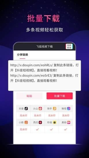 飞狐视频下载器app是一款专为安卓用户开发的视频抓取软件,支持多个短视频平台的视频抓取,只需一键复制视频原链接即可快速获取无水印视频。用飞狐视频下载器,轻松获取无水印视频。