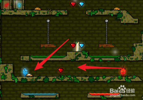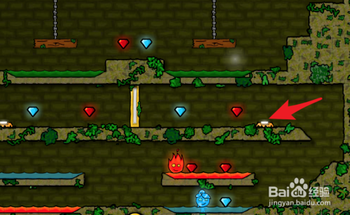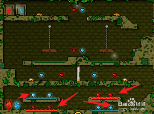 然后向上出发,这个时候可以发现对应的池子颜色正好和第1层相反,所以在跳上去的时候分清出这么走,这个时候冰娃就在左,火娃就去右了,然后进入池子收集对应的钻石,如图: