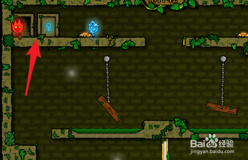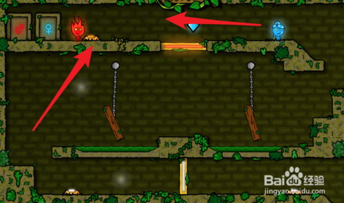 3、当两个冰火人各自站在一端的吊梯上,控制一端角色跳一下,由于惯性的作用,吊梯会缓慢倾向跳动的一端。