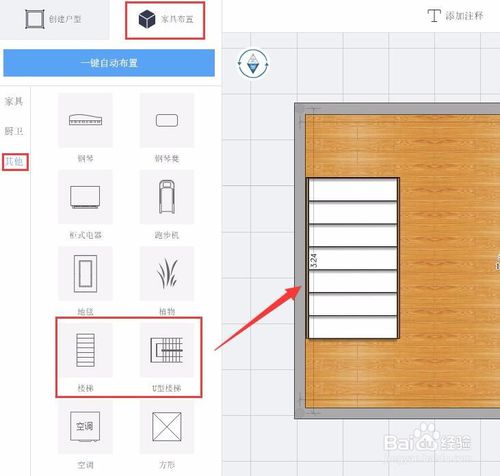 点击左边【家具布置】-【其他】选择楼梯模型拖到房间中使用即可。