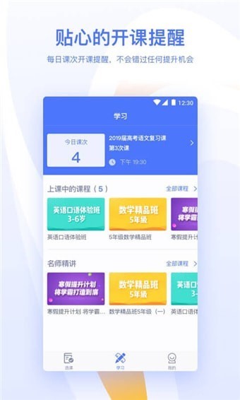 贴心的开课提醒:每日课次开课提醒,不会错过任何提升机会