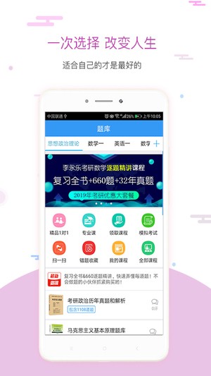考研题库是一款专门为考研的用户而打造的软件,考研题库app为用户提供联系、听课等功能,让您可以轻松应对考研。此外用户在软件内还可以进行1对1辅导,帮助您可以快速掌握学习技巧。