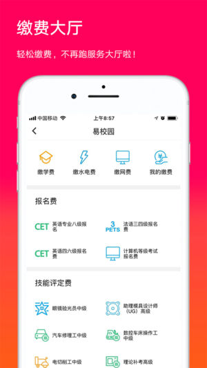 校内缴费服务——实现在线缴党费、缴学费、电费、水费、住宿费、报名费、补办校园卡、补办学生证等各种缴费项目,学生免跑服务大厅,不再排队,一键搞定在线缴费。