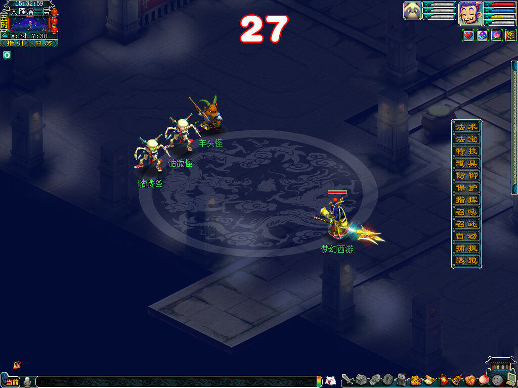 电脑版战斗界面的战斗功能键。在互通版中,我们将电脑版的战斗功能键一分为二,从单纯的单竖排现实划分为竖排和横排交叉排列。竖排是与攻击相关的功能键(攻击、法术、法宝、特技、道具、召唤),横排是与防御、捕捉召唤兽相关的功能键(捕捉、逃跑、召还、保护、防御)。这样的横纵交叉布局更加符合手机屏幕的显示特征,有利于玩家的便捷操作和提升互通版的游戏体验。