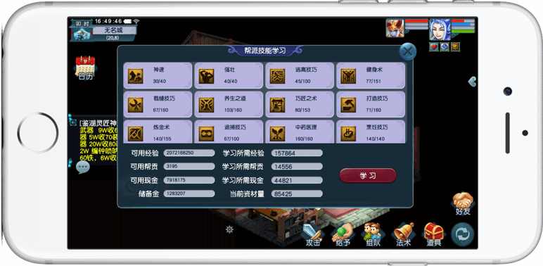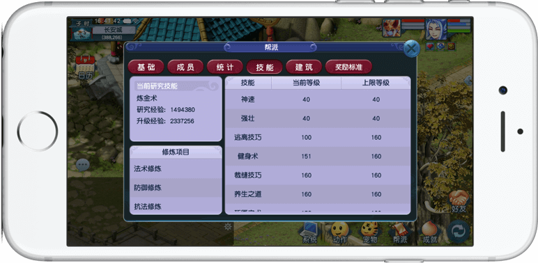 在“技能”处玩家可查看当前帮派技能的研究进度