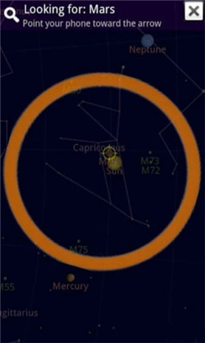 对满天的星星,用户要想找到自己想找的星星好比大海捞针。不过可以点击菜单键,选择搜索,在搜索框输入关键字进行搜索中输入关键字如“天秤座”,谷歌星空会在屏幕上显示一个圆圈状的箭头指示星座方位,用户只需调整手持手机的方向和角度,就可以轻松找到想要找的星座了,而且此时手机所指向的方位就是真实的星座在天空中所在的位置。