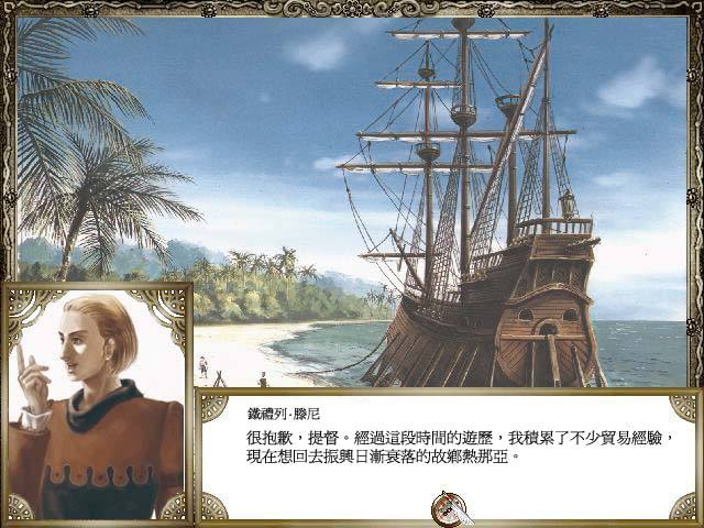 从斯德哥尔摩出发,在舒派亚的势力范围与其开战。战胜后得到船、货和国家的赔偿金。在里斯本招到杰拿斯,得到一艘小船。在塞维尔招到埃米利奥,热那亚酒馆招到弗利奥。在伊斯坦堡的港口招到安杰洛,在亚历山大港口招到铁礼列,出港遇海雷,选择"逃跑"(目前你能搞他,就搞死他)海雷丁建议你去新大陆。(到这里,人物招的差不多了!可以回了)回北海,在南特出港时弗利奥叫你去找孙女,在伦敦找到克利斯蒂娜,在伦敦同业公会接到任务找在西拉库萨的尤里斯,完成后出现遗迹,得老旧的羊皮纸,势力第一时,钱也第一时,丽璐给你红色的染料。