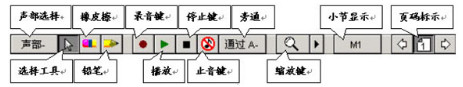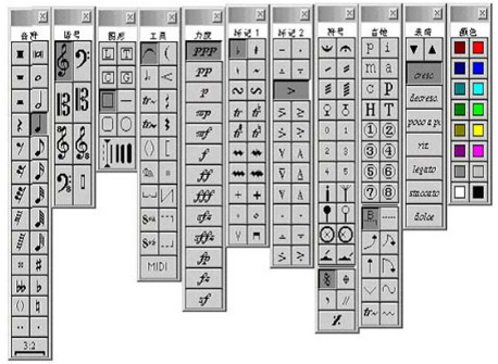 工具条共有11条,包括音符、谱号、图形、工具、力度、标记1、标记2、符号、吉他、表情、颜色等绘谱所需要的工具。他们可以在工作过程中根据需要打开、关闭和移动。如果这个工具条看不见了,可在“窗口菜单”的“工具条”中点击“音符” 工具条(或其他工具条),重新打开他。