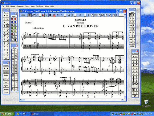 Encore软件是一个专门为MIDI制作而设计的软件,其目的就是制作和打印专业而且又非常标准的五线谱。这个乐谱编辑软件的界面比较简洁,给人一种非常清晰的感觉,虽然看上去这个软件非常简单,但是它也同样提供了大量的工具按钮,在编辑乐谱的过程中可以随时调用,来进行乐谱的设计。大部分乐谱都可以轻松的制作。实用的乐谱编辑软件,就是对于一个不识谱的来说,那个节拍的输入好麻烦。乐谱编辑(Encore)绝对好用的打谱作曲软件,打谱速度快,排版简单。