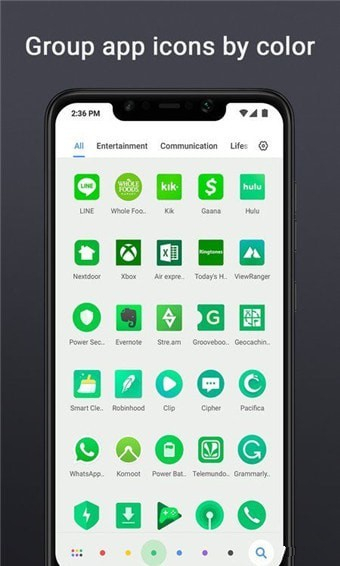 OCO桌面中还提供了一个可以根据图标颜色来筛选应用的方式。屏幕底部有红、橙、绿、蓝、黑几种颜色的小圆点,点击选中后,可以看到所有对应颜色的应用图标。这点和之前锤子手机中的强迫症图标排列方式有些类似,都是根据应用图标颜色来进行分类。