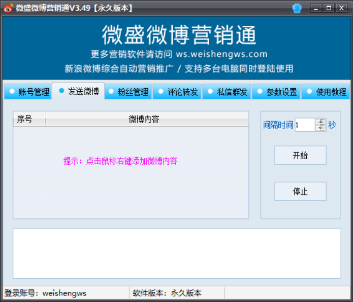 微盛微博营销通是一款全自动的微博推广营销工具,帮助实现自动发微博,发私信,转发评论和点赞微博,获取微博用户添加关注等等实用功能,可以多个微博账号自动推广操作。微博营销通软件所有功能均为真实自动操作,支持自动识别和输入验证码功能,无需人工值守。软件使用账号授权不绑定电脑,可以在多台电脑同时登陆使用。