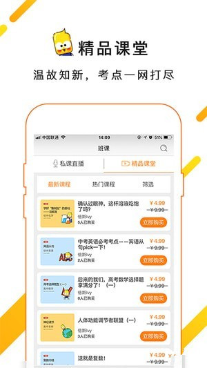 班课包括【私课直播】和【精品课堂】,让你无论是想要领先于学校基础课程进度,还是专攻弱科难点、拔高冲分,都可以在私课平台上实现。