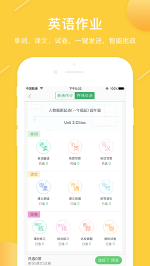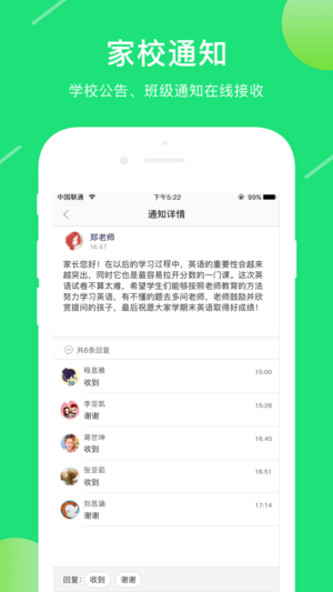 1、家校互动:教师、家长随时随地互发语音、图片、文字信息。老师布置作业、检查作业,学生做作业,系统自动批阅、实时提醒。老师还可在线管理班级资料。2、通讯录:自由组建群组,可组建老师群、学生群。语音、图片、文字等畅想“微信”聊天。