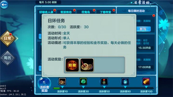 日环任务可以做30轮,每轮都会奖励巨多的经验,花费时间少,收益高,是游戏一上线必须要做的项目之一。