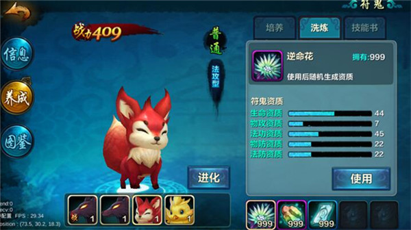 在获得合适的符鬼后就要养成它们,要注意符鬼的等级只能通过妖兽丹进行升级(可从符鬼岛获得),如果对当前的符鬼不满意可以用五色石、逆命花和还童符等来进行洗练,五色石可以随机生成技能(也可打书,技能书从丁格夺宝的藏宝图获得),逆命花会随机生成资质,而还童符则可以让符鬼回到初始状态。当符鬼等级到达35级之后,每过5级就会有一次进化机会,在完成突破之后即可进化为下一个阶段,拥有全新的外貌与能力!