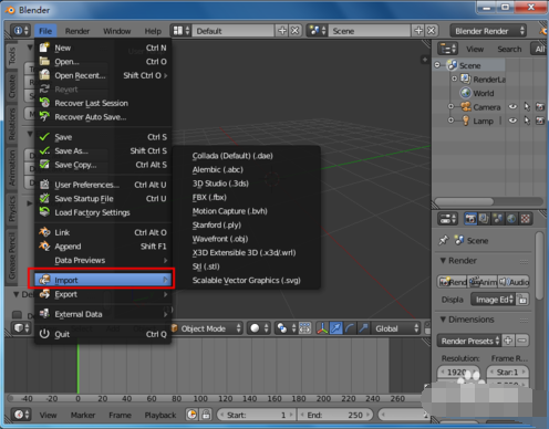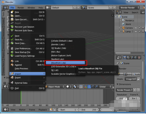 然后选择我们模型的格式,这里就是blender默认支持的一些模型格式,例如我我们导入obj格式的模型。