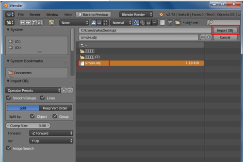 找到我们的obj文件所在路径并选中,然后“Import Obj”导入模型。