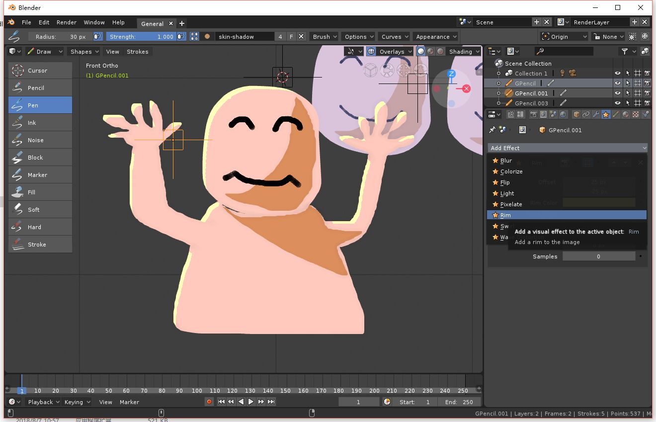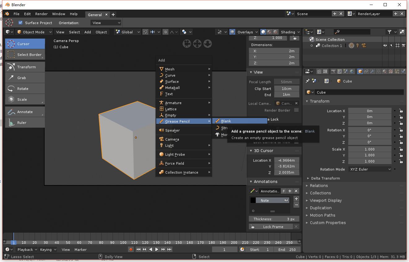 船新的GreasePencil现在被列入添加物体内(shift+A)今天的2.8版本界面如下: