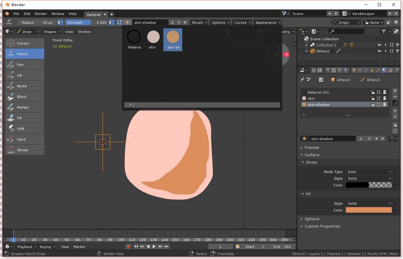 接下来看一下材质面板,这次GP为了方便画图,可保存材质,可以让你瞬间切换绘画内容,比如我们设置一个skin皮肤,只要选择皮肤材质就可以直接画出面积而不是线条,这都可以预设值好,方便和你的小伙伴一起创作分享,不至于搞乱了角色的皮肤色或者线条类型。材质里可以设置绘制的线条和填充颜色,也可以透明处理,线条支持虚线,支持感压,有手绘板的朋友可以畅快画图了,而且全部是矢量的,这增加了可控性,后面雕刻模式会讲到。