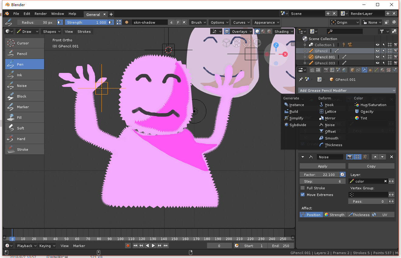 Blender内原本的一些修改器也支持GP了,相当给力,在制作动画的时候更方便了。如果你对这些修改器不理解,那么看blender3D内的修改器吧,大同小异。再左边是约束,部分约束也支持了,因为GP已经作为一个创建单元了,所以完全可以和3D内容一起联合创作。