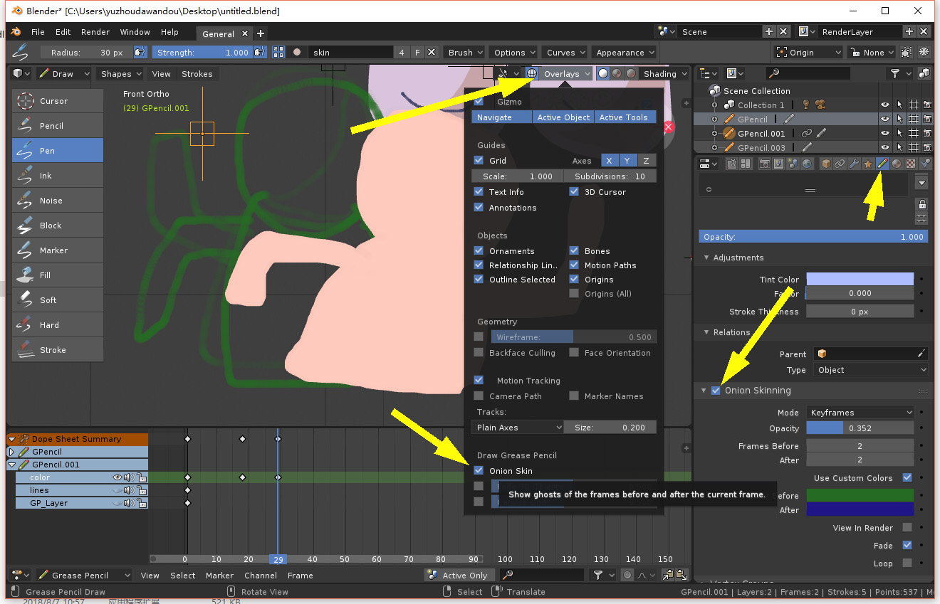关于绘制动画时候的洋葱皮功能,一定要在overlays里打开显示,不然是没有的。这个功能在制作动画的时候非常重要。