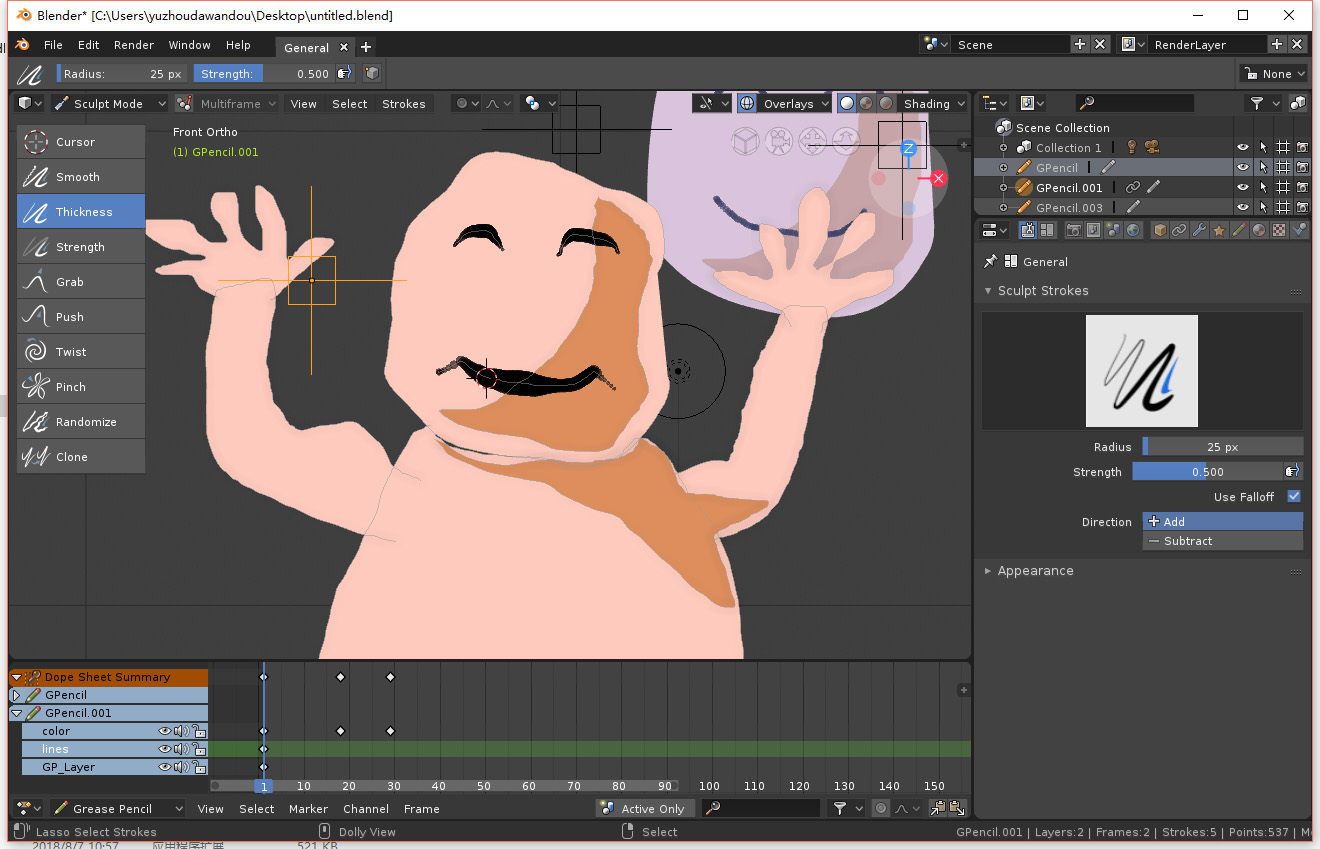 接下来看看层,和原来的 GP很像,不过这次多了层矫正控制,可以控制颜色和线条粗细,但不破坏原有数据,并且提供了父子关系,方便制作动画。提供了洋葱皮,方便你绘制关键帧,提供更多的视图显示信息
