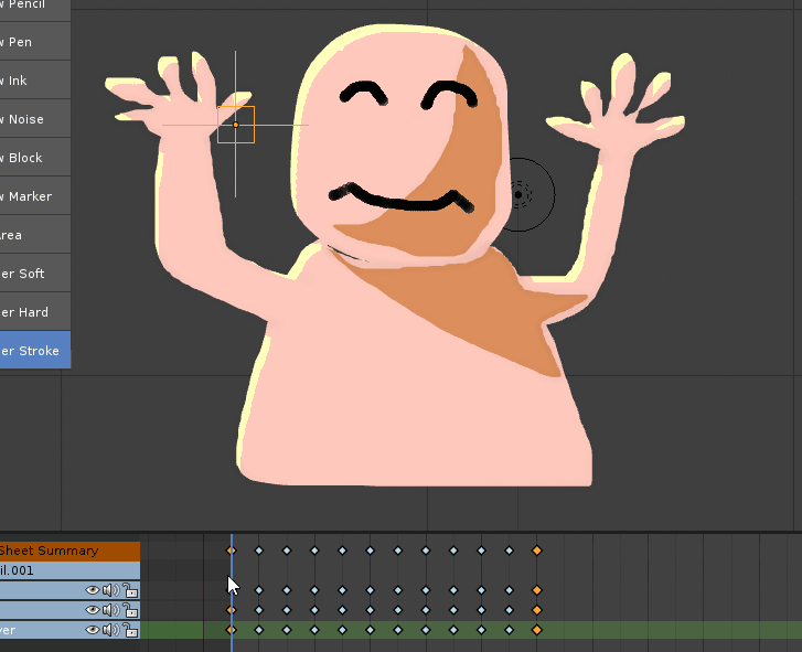 雕刻模式下,可以看到左边的一堆雕刻工具,因为是矢量的关系,矢量线条的点是可控的,这也方便我们在画的不准的时候,线条粗细不满意,都可以使用雕刻工具进行微调,更舒服的是雕刻支持关键帧动画的,只要在空白的没关键帧的地方雕刻,即可生成新的雕刻后的关键帧,这样作细微的动画调整是不是更简单了呢?